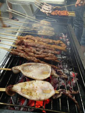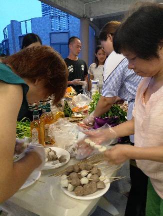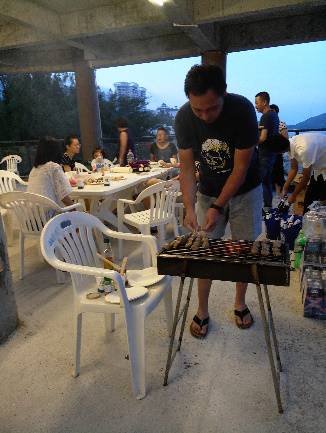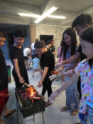 夜幕降臨,燒烤于大廳,齊心協(xié)力共制山珍海味之美食,眾悅,稱心如意也!